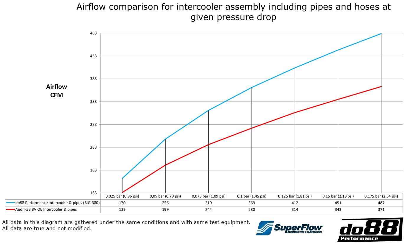 Trykkrørene i vår BigPack er designet for å komplementere og ytterligere forbedre ytelsen til do88 intercooler. De originale trykkrørene har flere ineffektive bend og har ikke ytelsesoptimalisert design. Settet vårt er både betydelig større og fullstendig strømningsoptimalisert, noe som betyr at det flyter hele 31 % mer enn originalt!