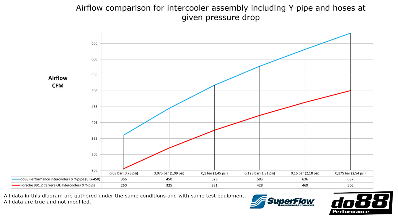 Kjøling er viktig, og det er også luftstrøm. Etter mange timer med utvikling, forfining av endetankene og valg av cellepakke for å møte våre krav, er resultatet en intercooler som er mye mer effektiv når det gjelder varmeoverføring og luftstrøm. Med vår interne Superflow SF-1020 Probench flow bench, verifiseres luftstrømmen som et komplett system, med slanger på både inntak og utløp, for både OEM 991 intercoolers og do88 ytelsesintercoolers.