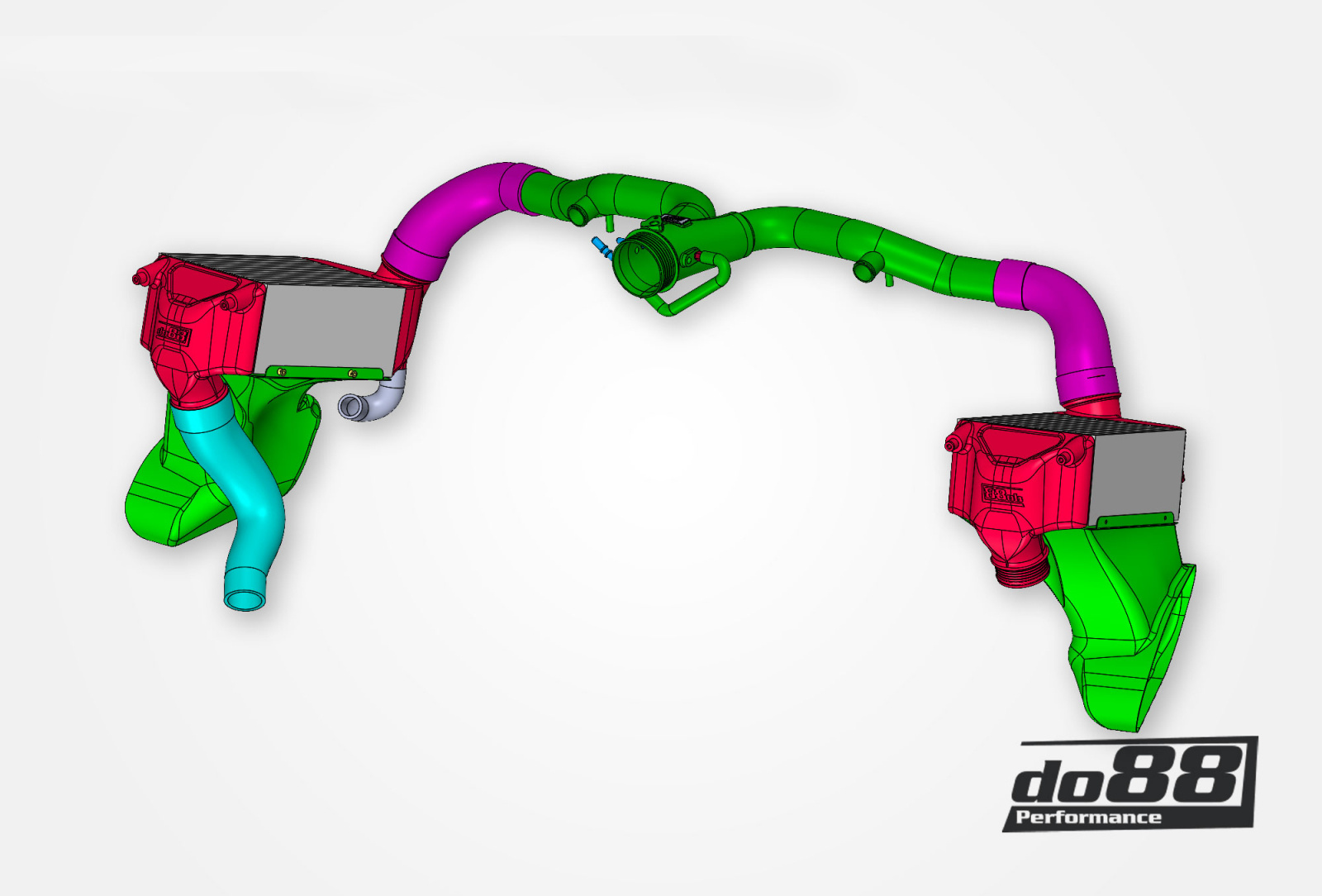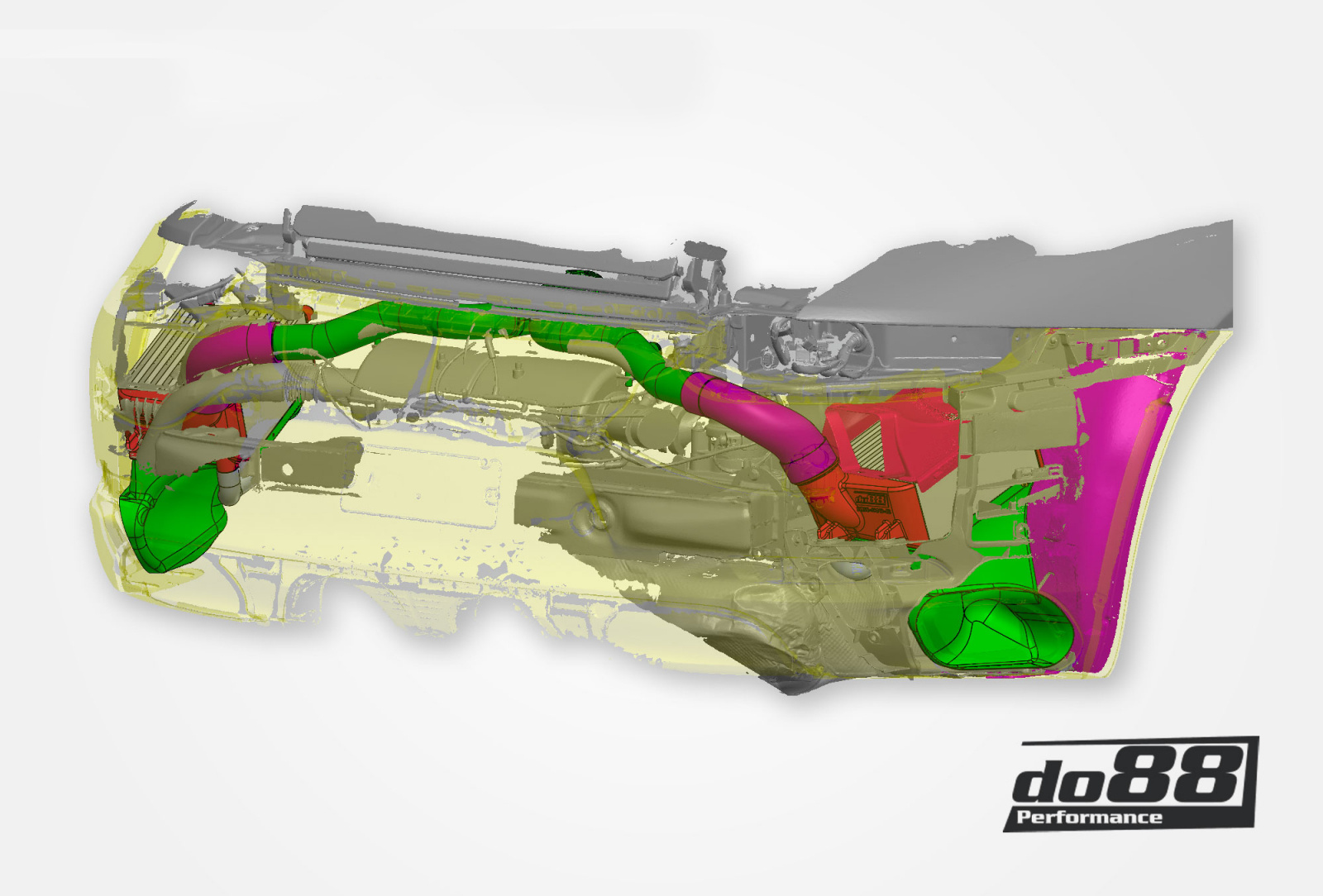 For å optimalt distribuere strømmen over hele kjernen, bruker vi støping, strømoptimaliserte tanker. En godt utformet tank er avgjørende for å maksimere varmeoverføringsegenskapene og strømningen. Strøm og kjølekapasitet avhenger direkte av kjernens dimensjoner, og for å utnytte så tykk en kjerne som mulig, har vi erstattet de øvre luftguidene med karbonfiberguider. Disse er designet av do88 med 3D-skanning som basis, noe som garanterer en utmerket passform mot både bilens karosseri og våre store intercoolere.