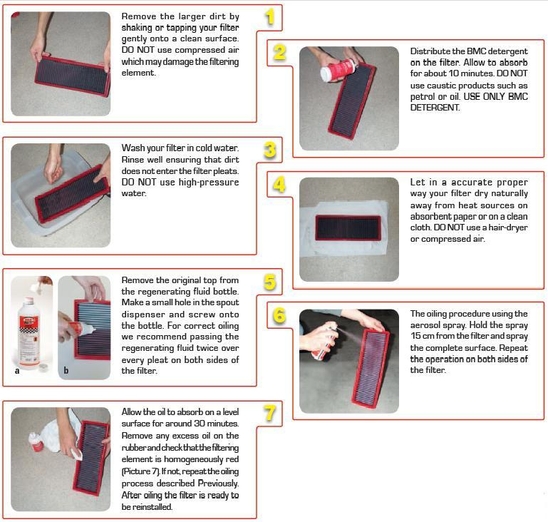 Vaskemiddelet fjerner den eksisterende partikkeloppbygningen og smussrester, og etterlater deretter en ren bomullsfilteroverflate klar for BMC-regenereringsvæsken (filterolje). Det anbefales å rengjøre filter hver 24. 000 km (15.000 miles) (avhengig av bruk og lokale forhold) for å opprettholde perfekt filtrering.
