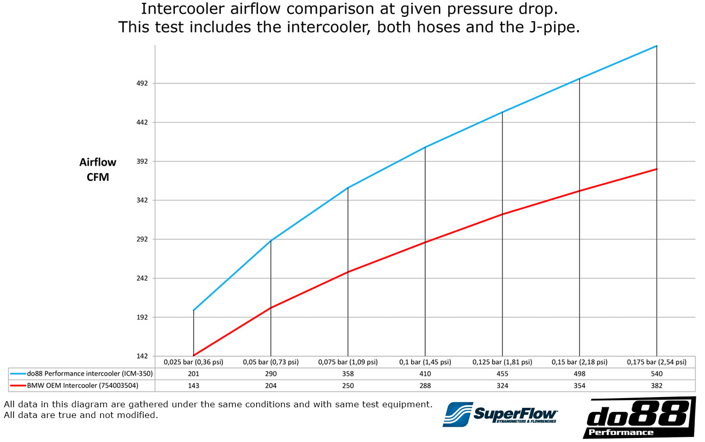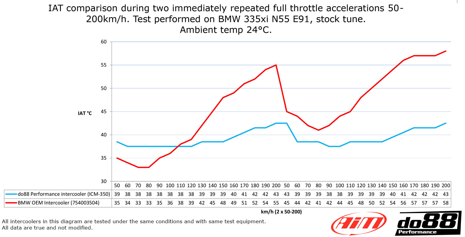 - Lägre temperatur efter intercooler vid samma testförhållanden: 43°C (58°C), 15°C lägre! Mätt på 335xi N55 helt original förutom intercoolern.