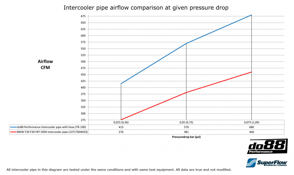 Denne pakken er til deg som har høye effektmål, og som vil oppgradere til det absolutt beste! Intercooler røret vårt har betydelig bedre gjennomstrømning enn det originale intercooler røret, noe vi har verifisert både i bil og på vår egen SuperFlow SF-1020 testbenk.