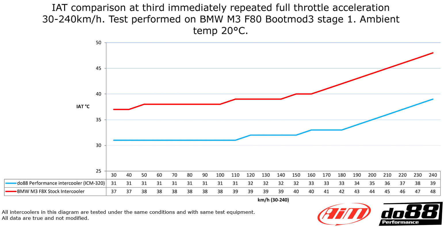 Vårt mål när vi startade utvecklingen av vår nya intercooler var att eliminera alla svagheter i originalintercoolerns design och naturligtvis öka prestandan rejält. Under alla tester som vi utfört under utvecklingen av hela vårt BMW F8X M2C / M3 / M4 produktsortiment ser vi tydligt hur effekten är direkt sammankopplad med insugstemperaturen.