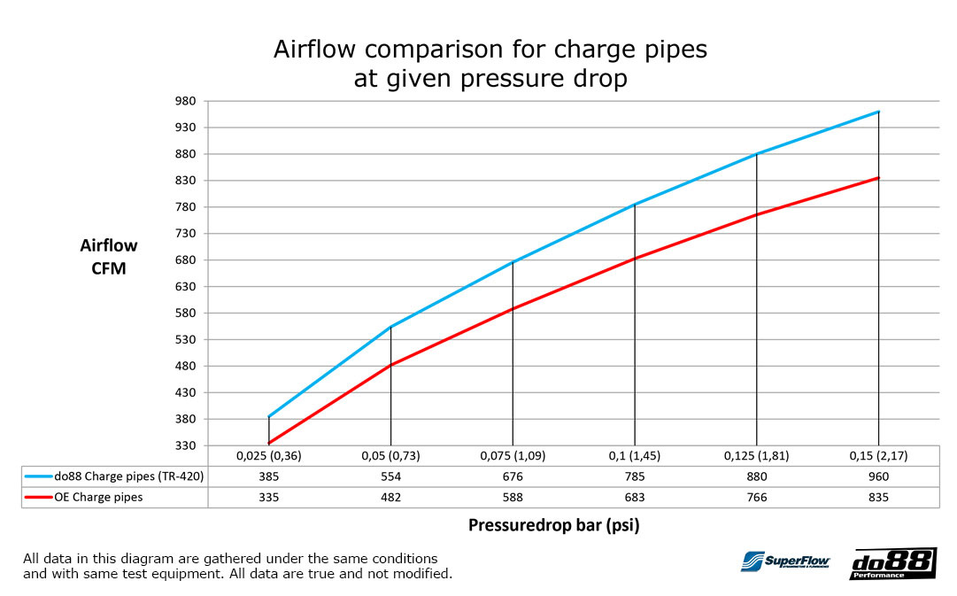 - Oppnår en flyt på 960 CFM @ 150mbar (2,17psi), som betydelig overstiger OEMs 835 CFM.