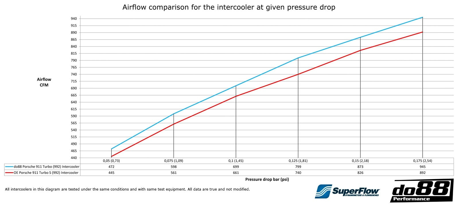 Först gjordes fyra repor med OE 992-intercooler monterad. Stopp, snabbt byte av delar på plats. Några minuters uppvärmning och sedan fyra repor med do88-intercooler på exakt samma sätt som med OE några minuter tidigare. Temperatursänkningen är slående, 12°C maximal skillnad, se grafen nedan. Kylning är viktigt, men även flöde. Efter åtskilliga timmar på ritbordet med slipning och förfining av tankarna kombinerat med ett cellpaket för att möta våra krav har vi ett resultat som talar för sig självt. Med vår egen flödesbänk Superflow SF-1020 har vi verifierat flödet för både OE 992 samt do88 laddluftkylare. Det ni ser är det ni får – sann prestanda!