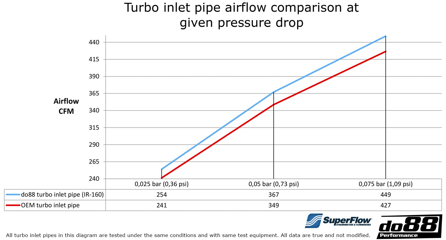 do88 inntaksrør har en luftgjennomstrømning ved 0,075 bar trykkfall på 449 CFM, mot originalrørets 427 CFM.