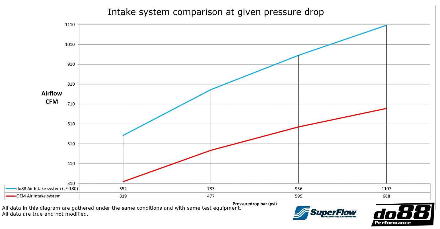 do88 innsugsystem har en luftgjennomstrømning ved 0,1 bar trykkfall på 1107 CFM, mot originalrørets 688 CFM!
