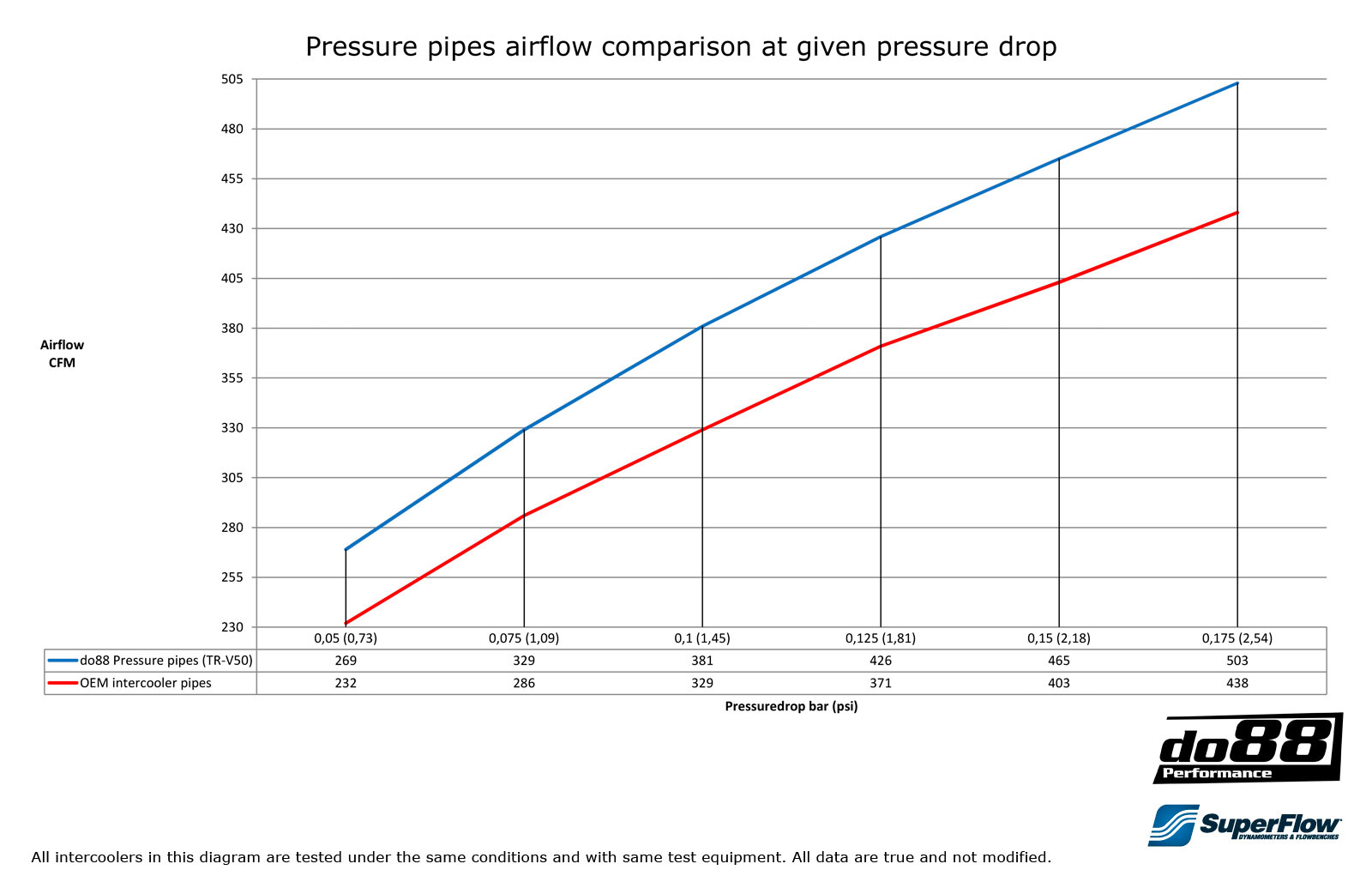 Denne pakken er til deg som har høye effektmål, og som vil oppgradere til det absolutt beste! Intercooler røret vårt har betydelig bedre gjennomstrømning enn det originale intercooler røret, noe vi har verifisert både i bil og på vår egen SuperFlow SF-1020 testbenk.