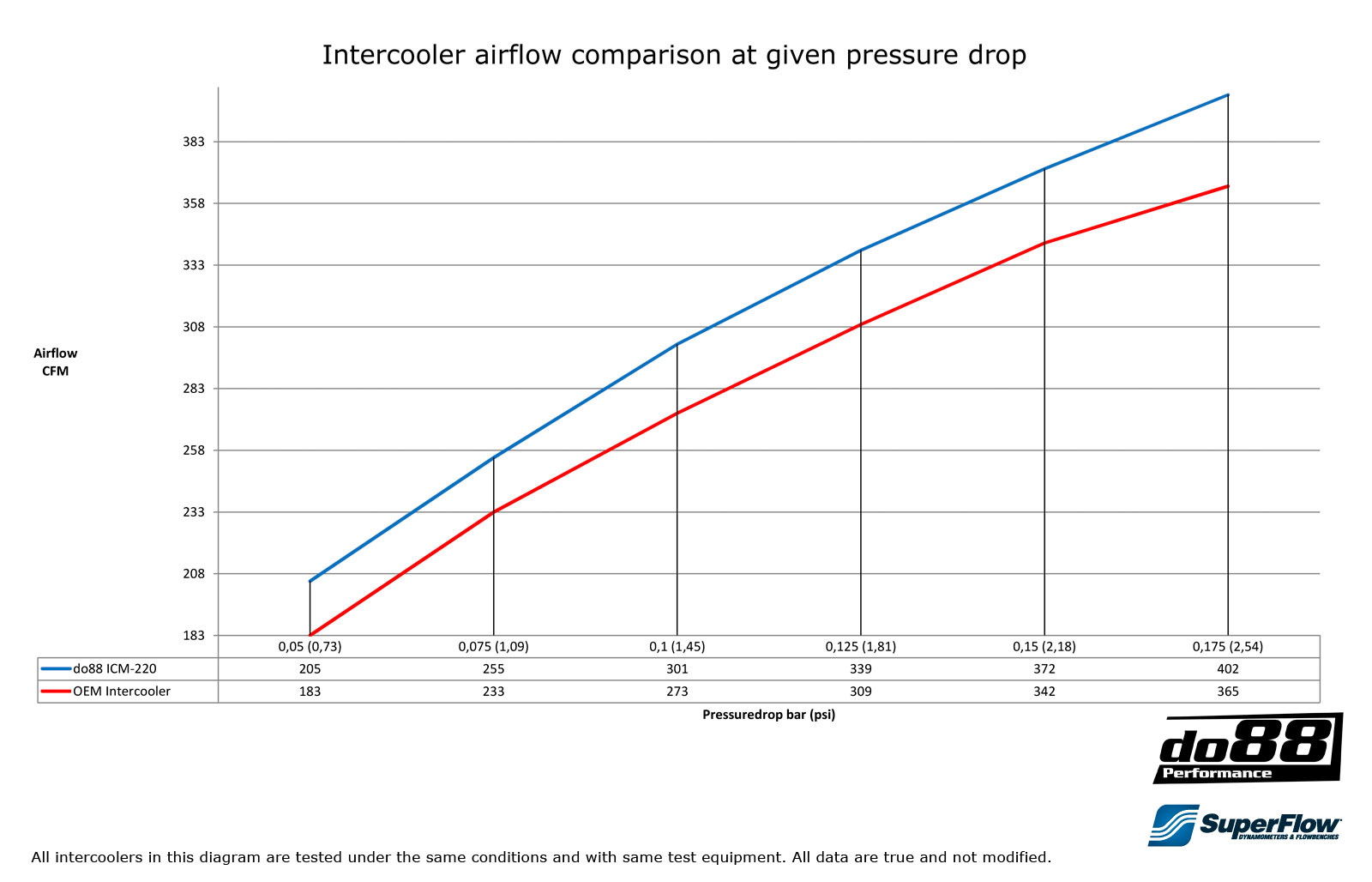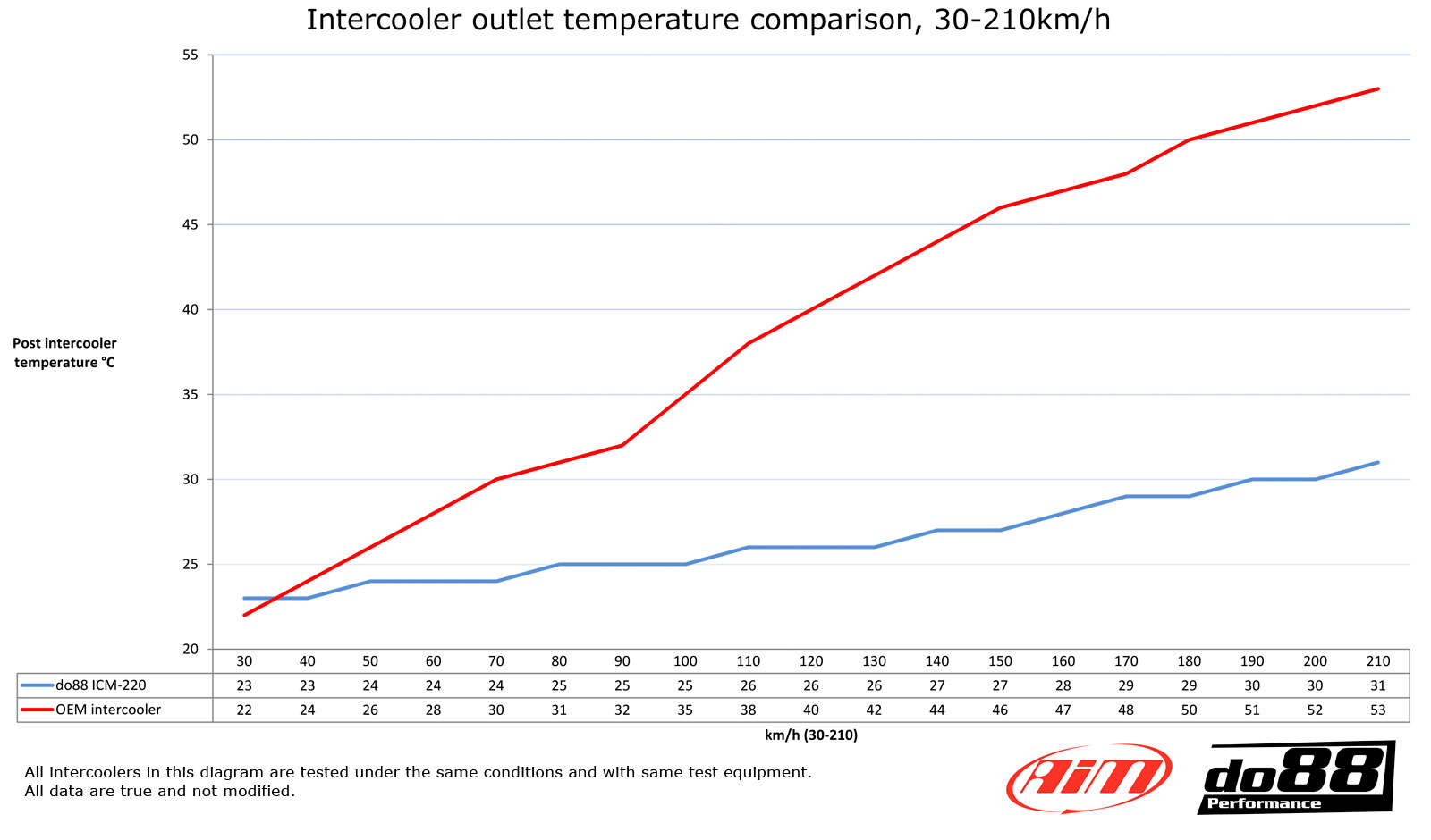 Hele 114 % større cellepakkevolum er en forskjell vi er stolte over å ha fått til. Det er noe man virkelig merker. Motoren trekker betydelig bedre over hele registeret og tåler gjentatt rusing uten å bli overopphetet. Oppfatningen om at ladeluftkjøleren ikke behøver å byttes før man oppnår høy trimmegrad er ikke riktig, om den er aldri så utbredt. På varme norske sommerdager, ved gjentatt trekking, inspirert kjøring eller generelt i et varmere klima kreves det ingen store anstrengelser for motoren for at den skal begynne å generere farlig høye innsugstemperaturer. Dette gjelder også helt utrimmede biler. Standard-intercoolerens kjøleevne er i mange tilfeller svak, noe som går ut over motoren og motorkraften. Varmen må ledes bort, ellers vil den lovede effekten avta drastisk så snart man begynner å gasse. Denne intercooleren garanterer at bilen alltid leverer det den er god for!